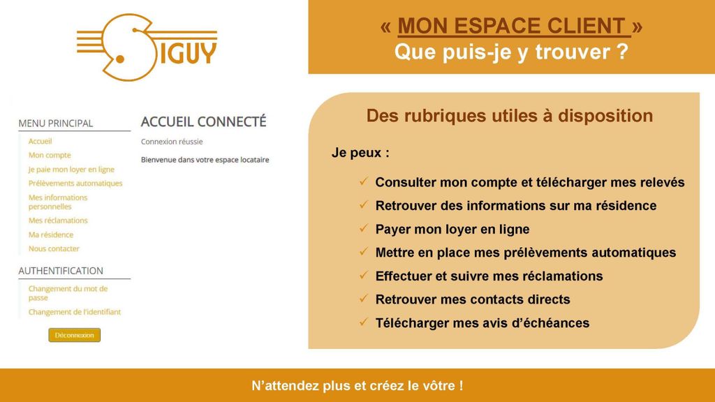 Votre espace client vous permet de payer votre loyer, de consulter vos transactions, de mettre à jour vos informations personnelles, d’effectuer et suivre vos demandes… Créez votre espace pour accéder à toutes ces fonctionnalités simple et pratiques.